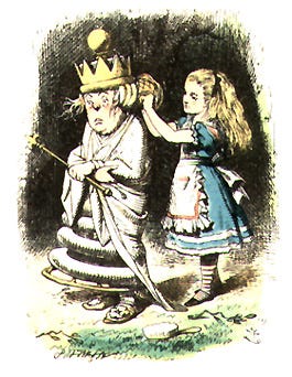 - Me parece evidente que no tienes mucha práctica -replicó la Reina. - Cuando yo tenía tu edad, siempre solía hacerlo durante media hora cada día. ¡Cómo que a veces llegué hasta creer en seis cosas imposibles antes del desayuno!